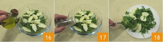 Tempere com azeite 16, sal e pimenta 17, misture um pouco e transfira a salada assim temperada para o prato de servir 18