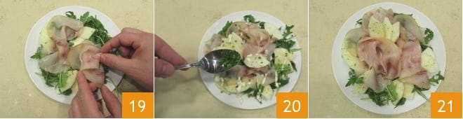 Coloque o carpaccio de espada sobre a cama de salada, dispondo as fatias em forma de rosa 19. Regue o carpaccio com o molho preparado anteriormente, e polvilhe com a cebolinha picada 20. Seu carpaccio de espada defumado com salada de maçãs e rúcula está pronto para ser servido 21!