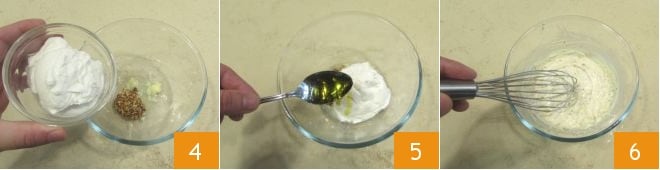Adicione também o iogurte grego 4, tempere com o azeite de oliva 5 e misture bem com um batedor, até tornar o molho liso e homogêneo 6.