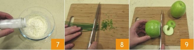 Ajuste o molho com pimenta e sal 7 e reserve. Pique finamente a cebolinha 8 e reserve também. Passe então para as maçãs: corte fora as partes superiores e inferiores com o cabinho 9