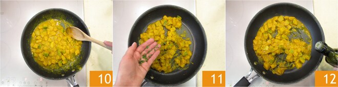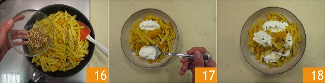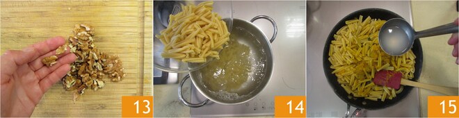 Pique grosseiramente os miolos de noz 13. Enquanto isso, cozinhe as casarecce em água salgada fervente 14, escorrendo-as diretamente na panela com a abóbora alguns minutos antes do término do cozimento da massa. Adicione um pouco da água do cozimento 15, sem reacender o fogo.