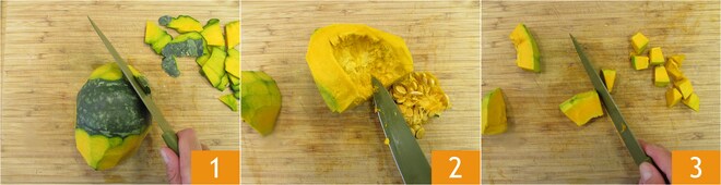 Para preparar as casarecce com abóbora, nozes e burrata, retire a casca da abóbora e as sementes 1 2, depois corte em pedaços irregulares de cerca de 2 cm 3.