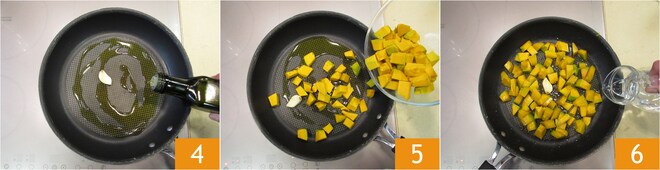 Derrame um fio de azeite na panela e adicione o dente de alho 4. Deixe fritar por alguns minutos e depois adicione a abóbora 5. Deixe cozinhar em fogo alto por 5 minutos, mexendo de vez em quando, e depois adicione os 125 g de água 6.