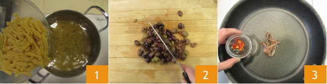 Para preparar as casarecce com creme de ricota, azeitonas e anchovas, você pode preparar o molho enquanto a massa cozinha (recomendamos que fique bem al dente!) 1. Enquanto isso, pique grosseiramente as azeitonas 2, depois, em uma frigideira larga, adicione as anchovas e a pimenta cortada em rodelas 3.
