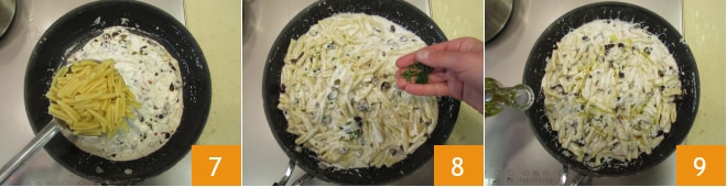 Escorra a massa quando faltarem 2-3 minutos para o final do cozimento, diretamente na frigideira com o molho 7. Você pode ligar novamente o fogo baixo e misturar, adicionando água se necessário. No final do cozimento, perfume com salsinha picada 8 e um fio de azeite cru 9. Se quiser, adicione mais um pouco de pimenta fresca cortada em tiras e sem sementes, e suas casarecce com creme de ricota, azeitonas e anchovas estão prontas, bom apetite!