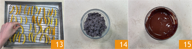 Para preparar as cascas de laranja cristalizadas, corte as laranjas não tratadas e com casca grossa em gomos 1, depois com uma faca retire a polpa 2. Corte a casca em tiras de 0,5 cm de largura, seguindo o sentido dos gomos 3; você deve obter cerca de 300 g de cascas.
