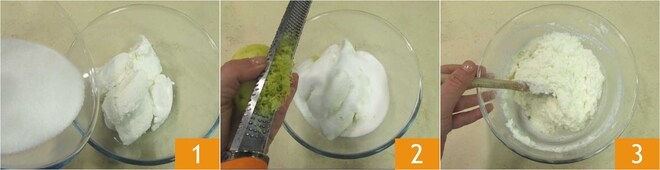 Para preparar a cassata assada, primeiro coloque a ricota para escorrer em uma peneira e deixe-a na geladeira por pelo menos algumas horas, ou até durante a noite, para que perca o excesso de líquido. Passado esse tempo, prepare o recheio: coloque em uma tigela a ricota de ovelha e o açúcar 1, aromatize com a casca ralada de meio limão 2 e misture bem 3.
