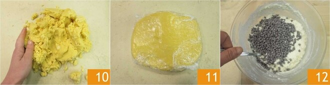 Processe para compactar tudo, depois transfira a mistura obtida para a superfície de trabalho 10 e forme um bloco. Envolva a massa no filme plástico 11 e deixe descansar na geladeira por pelo menos uma hora. Após o tempo de descanso da massa, pegue o creme de ricota e adicione as gotas de chocolate, depois misture bem para incorporá-las uniformemente 12.