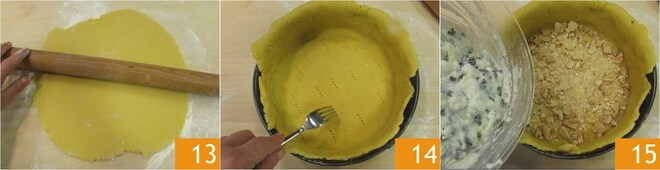 Abra dois terços da massa em uma superfície levemente enfarinhada até a espessura de 7 mm 13 e forre uma forma de 24 cm de diâmetro, incluindo as bordas, depois fure a base com os dentes de um garfo 14. Esfarele metade dos biscoitos secos na base e adicione o recheio de ricota e gotas de chocolate 15.