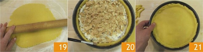 Nivele a ricota com as costas de uma colher 16 e adicione a outra metade dos biscoitos secos esfarelados 17, depois elimine o excesso de massa das bordas com uma faquinha 18.