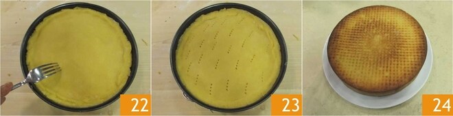 Fure a superfície com os dentes de um garfo 22 23 e asse em forno estático pré-aquecido a 170°C por 120 minutos, na prateleira do meio. Depois, transfira a forma para a prateleira mais baixa e asse por mais 10 minutos. Uma vez assada, retire o bolo do forno e deixe esfriar completamente antes de virá-lo em um prato de servir 24.