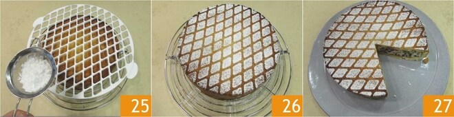 Polvilhe com açúcar de confeiteiro a gosto, usando um estêncil 25 para obter uma graciosa decoração em losangos 26. Sua cassata assada está pronta para ser servida 27!