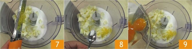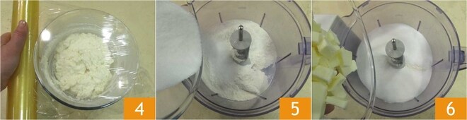 Cubra a tigela com filme plástico 4 e coloque na geladeira. Passe para a preparação da massa: em um processador de alimentos com lâminas de aço, adicione a farinha, o açúcar de confeiteiro 5 e a manteiga fria da geladeira cortada em cubos 6.