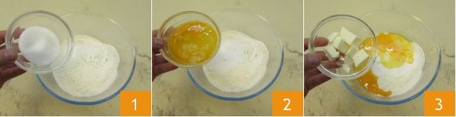 Para preparar as cassatelle de Carnaval, em uma tigela grande, coloque a farinha, o açúcar 1, uma pitada de sal, os 2 ovos em temperatura ambiente 2, a manteiga em pedaços fria, mas não gelada 3,