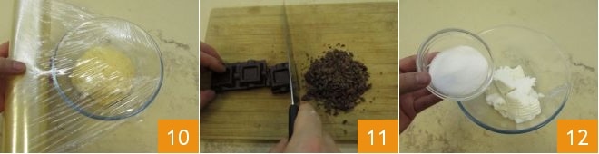 Cubra com filme plástico 10 e deixe descansar por 30 minutos fora da geladeira. Enquanto isso, prepare o recheio: pique finamente com uma faca o chocolate amargo 11, cuidando para não deixar pedaços grandes que possam furar a massa durante o cozimento. Em uma tigela, coloque a ricota de ovelha, o açúcar 12,