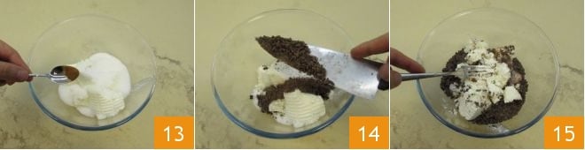 aromatize com a canela 13 e adicione o chocolate picado anteriormente 14. Misture com um garfo para incorporar os ingredientes 15.