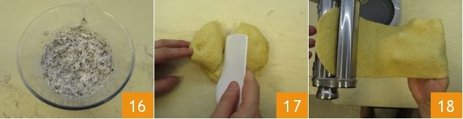 Reserve o recheio 16 e retome a massa das cassatelle: divida o bloco ao meio 17 e então estenda-o com a máquina de macarrão 18 até o número 7, obtendo assim uma espessura de cerca de 1 mm.