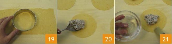 Depois de estender a massa, divida ao meio o retângulo e corte discos com um cortador de massa de diâmetro de 11,5 cm 19. Coloque uma colher de chá de recheio no centro dos discos 20, umedeça as bordas com um pouco de água 21, para que o recheio, dobrando a massa, seja selado perfeitamente.