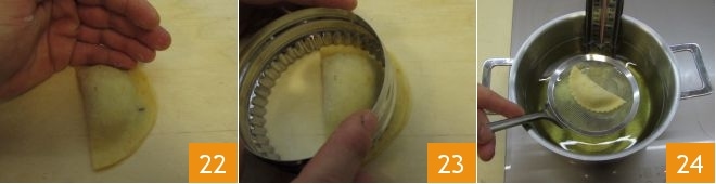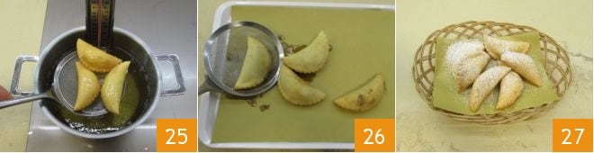 Feche as cassatelle formando uma meia-lua e selando bem as bordas, pressionando com as costas da mão ao redor 22. Corte a borda do semicírculo, aparando a parte com o recheio, com um cortador de massa dentado para criar uma borda decorada 23. Continue assim para o restante da massa: com as quantidades indicadas, você obterá cerca de 20 unidades. Quando estiverem prontas, você pode fritar suas cassatelle de Carnaval: coloque o óleo de sementes para aquecer em uma panela de bordas altas e, quando atingir a temperatura de 170°C (a ser medida com um termômetro de cozinha), mergulhe as cassatelle delicadamente e poucas por vez 24 para não baixar muito a temperatura do óleo.