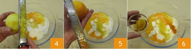 aromatize com a casca de limão 4 e a de laranja 5 e, por fim, tempere a massa com o marsala 6.