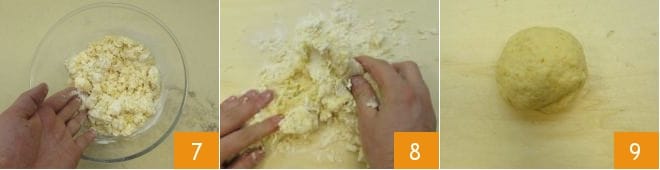 Amasse os ingredientes à mão 7 e, depois de reunir os líquidos, transfira a massa para uma superfície de trabalho 8, trabalhe-a até ficar lisa e compacta 9.