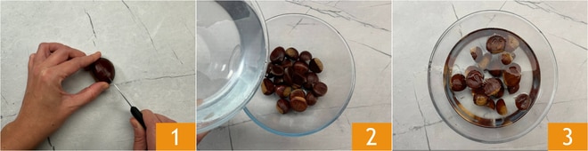 Para preparar as castanhas na frigideira, primeiro faça um corte transversal na parte superior das castanhas 1. Coloque-as em uma tigela, cubra com água fria 2 e deixe de molho por 15 minutos 3.