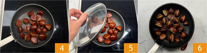 Escorra e seque as castanhas. Transfira-as para uma frigideira de fundo grosso, dispondo-as em uma única camada 4, cubra com uma tampa 5 e cozinhe em fogo médio por 15 minutos, agitando a frigideira de vez em quando. As castanhas devem ficar bem tostadas, mas macias por dentro, isso acontece devido ao vapor que se desenvolve na frigideira graças à presença da tampa. Suas castanhas na frigideira estão prontas para serem degustadas 6.