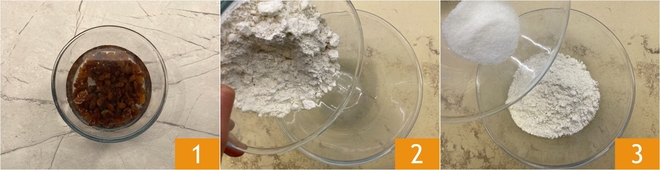 Para preparar as castagnole veganas assadas, primeiro coloque as uvas-passas de molho em água fria 1. Enquanto isso, coloque em uma tigela a farinha 2 e o açúcar 3.