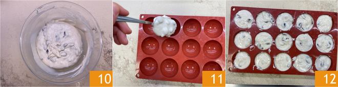 Você deverá obter uma massa homogênea 10. Pegue uma forma de silicone com semiesferas de 5 cm de diâmetro (ou alternativamente, você pode usar forminhas de papel) e preencha-a com a massa obtida 11. Asse em forno estático pré-aquecido a 180°C por cerca de 20-25 minutos 12 ou até dourar.