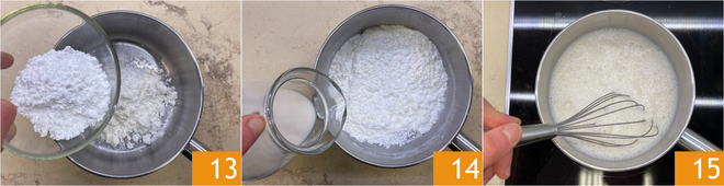 Enquanto isso, dedique-se ao creme: em uma panela, junte o amido de milho e o açúcar de confeiteiro 13, depois adicione o leite de aveia quente 14 e misture bem com o batedor. Coloque a panela no fogo e continue mexendo até atingir a densidade desejada 15.