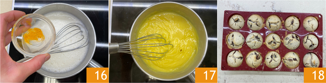 Se desejar, pode colorir o creme com uma pitada de cúrcuma 16. Uma vez engrossado 17, transfira o creme para uma tigela, cubra com filme plástico em contato e deixe esfriar. Decorrido o tempo de cozimento, retire a forma com as castagnole 18.