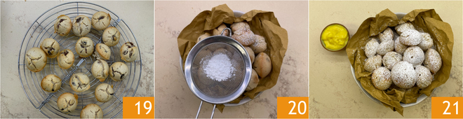 Desenforme-as e deixe esfriar sobre uma grade 19, depois polvilhe com açúcar de confeiteiro a gosto 20. Suas castagnole veganas assadas estão prontas para serem saboreadas, acompanhadas com o creme veg 21!