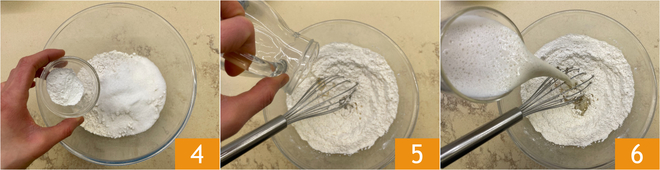Adicione também o fermento químico em pó 4 e misture com um batedor para incorporar os pós, depois adicione os líquidos: o óleo vegetal 5 e o leite de aveia 6.