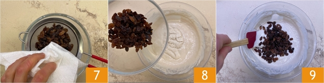Agora escorra e seque as uvas-passas 7, depois incorpore-as à mistura 8, mexendo com uma espátula 9.