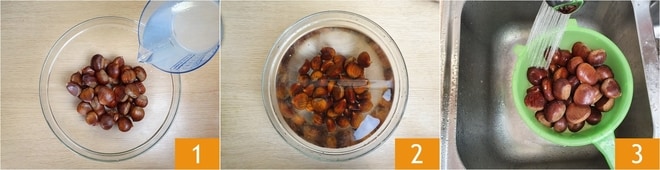 Para preparar castanhas cozidas, primeiro escolha as castanhas, descartando aquelas furadas ou abertas. Em seguida, transfira-as para uma tigela e cubra completamente com água em temperatura ambiente 1. Deixe as castanhas de molho por 2 horas 2. Após o tempo, lave as castanhas em água corrente 3.