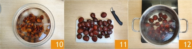 Para preparar castanhas em calda de rum, como feito anteriormente, escolha as castanhas mais bonitas, não danificadas. Deixe de molho por 2 horas 10, depois enxágue e seque. Faça cortes nas castanhas ao longo da circunferência 11 e mergulhe-as em água fervente, levemente salgada 12. Desta vez, as castanhas devem cozinhar por apenas 15 minutos.