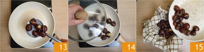 Aqueça bem uma panela grande e assim que os 15 minutos passarem, escorra as castanhas com uma escumadeira e transfira-as para a panela quente 13. Cubra com uma tampa 14 e cozinhe em fogo por cerca de 1 minuto e meio. Após esse tempo, transfira as castanhas para uma tigela, onde você terá colocado um pano de cozinha 15. Feche o pano, cobrindo as castanhas, e aguarde alguns minutos.