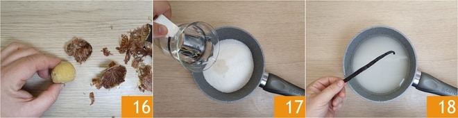 Comece a descascar as castanhas 16, pegando uma de cada vez do pano e deixando as outras quentes dentro dele. Quando todas as castanhas estiverem limpas, prepare a calda de açúcar e rum, onde as castanhas serão conservadas. Em uma panela, junte o açúcar, a água 17 e uma fava de baunilha cortada ao meio 18.