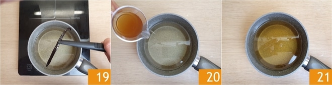 Deixe ferver por 5 minutos, sem mexer. Desligue o fogo e remova a fava de baunilha 19. Adicione o rum 20 e misture brevemente 21.