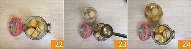 Coloque as castanhas descascadas em potes esterilizados 22 e despeje a calda quente por cima até cobri-las completamente 23. Feche os frascos ainda quentes com a tampa 24 e guarde-os na despensa, em temperatura ambiente.
