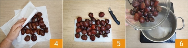Neste ponto, seque-as com um pano de cozinha ou papel toalha 4. Faça um corte horizontal ao longo de toda a circunferência da castanha 5, não apenas na parte arredondada. Esta etapa pode ser evitada, serve para evitar que as castanhas estourem durante o cozimento. Um pouco de água pode penetrar durante o cozimento ao fazer cortes nas castanhas. Ferva uma panela de água, adicione um pouco de sal e transfira as castanhas para dentro 6.