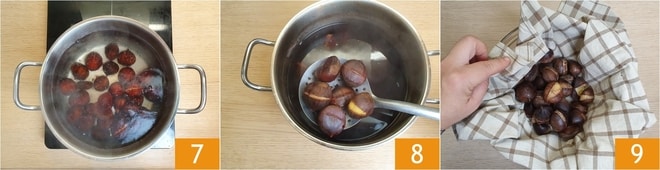 Cozinhe em fogo médio por 40-45 minutos 7. Em seguida, escorra bem as castanhas 8 e transfira-as para uma tigela onde você terá colocado um pano de cozinha 9. Feche o pano por 10 minutos, assim será mais fácil descascá-las, e saboreie suas castanhas cozidas.