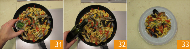 Polvilhe com salsinha picada 31 e uma pitada de pimenta preta. Finalize com um fio de azeite cru 32 e desfrute imediatamente dos cavatelli com frutos do mar 33.