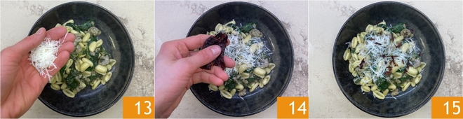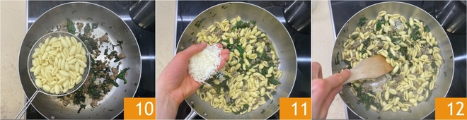 Escorra os cavatelli e transfira-os para a frigideira 10, regue com um pouco da água de cozimento e salteie brevemente tudo. Com o fogo apagado, misture com quase todo o queijo ralado 11 e mexa bem para incorporar 12.