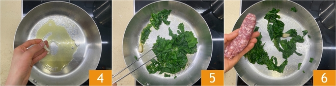 Em uma frigideira, aqueça um fio de azeite com um dente de alho esmagado 4. Escorra as folhas de nabo, reservando a água de cozimento que você usará para a massa. Corte grosseiramente as folhas de nabo e coloque-as na frigideira 5, depois adicione também a linguiça 6.