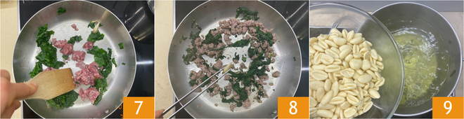 Refogue tudo em fogo médio desmanchando a linguiça com uma colher de pau 7. Quando a linguiça estiver bem refogada (isso levará cerca de 8 minutos), retire o alho 8. Enquanto isso, leve novamente a ferver a água do cozimento das folhas de nabo e cozinhe os cavatelli al dente 9.