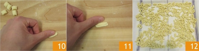 Com o polegar, pressione cada pedaço pelo lado do corte e arraste-o na bancada de baixo para cima 10 para criar o formato côncavo clássico 11. Coloque-os aos poucos sobre um pano levemente enfarinhado, depois os cavatelli de batata estão prontos para serem cozidos e temperados ao seu gosto 12!