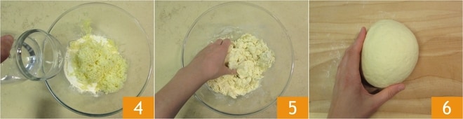Adicione também a água em temperatura ambiente 4 e misture a massa com as mãos 5, depois transfira para a bancada e continue trabalhando até obter uma massa lisa e homogênea 6.