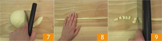 Com um cortador, divida a massa em porções menores 7, enfarinhe levemente a superfície de trabalho e estenda-as com a ponta dos dedos para obter cordões com espessura de cerca de 1 cm 8. Corte os cordões em pedaços com comprimento máximo de 2 cm 9.
