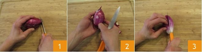 Para preparar as cebolas de Tropea assadas, primeiro remova a parte com as raízes 1 e descasque-as 2. Em seguida, corte-as no sentido vertical 3